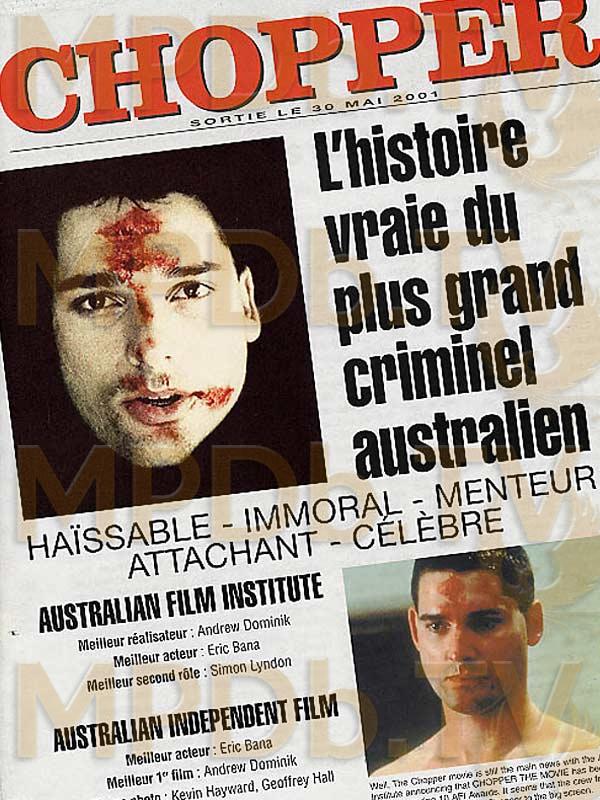 Inspiré de faits réels, Chopper, premier long-métrage d'Andrew Dominik, met en scène la vie de l'ennemi public n°1, Mark "Chopper" Read.Mark Chopper n'a pas eu une enfance facile, entre une mère dévote et un père qui n'aime pas beaucoup qu'on lui résiste. Aussi pour s'affirmer, il rêve depuis ses plus tendres années de devenir un vrai dur, un criminel de la pire espèce, de ceux dont on parle dans les journaux.A seize ans, il passe à l'acte et monte un attentat contre un juge, qui en réchappe. Chopper est aussitôt incarcéré dans le quartier de haute sécurité d'une prison australienne. Dès lors, malgré son jeune âge, il n'a de cesse de s'imposer comme le caïd auprès de ses compagnons de cellule.Alternant des actions d'une rare violence et des démonstrations d'affection qui laissent pantois, notre homme ne passe pas inaperçu. Son comportement auto-destructeur le pousse à provoquer des combats, à toujours agir contre le règlement du pénitencier.Libéré au bout de huit ans, il tue un mineur et retourne aussitôt derrière les barreaux. C'est alors qu'il se lance dans la rédaction de ses mémoires.